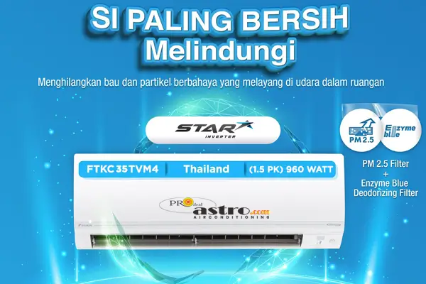 Daikin Star Inverter menawarkan performa luar biasa untuk kenyamanan maksimal. Fitur seperti PM 2.5 filter menghilangkan partikel halus dari udara.